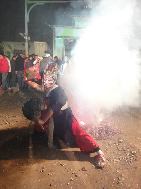雖然說是餘興節目,但是家將還是超專業,看著同袍坐炮,其他家將可是不會在旁邊嘻鬧。甚至范爺坐炮之前認為炮堆不夠多,也不會開口講話,只用法器比了比要人再拿多一點鞭炮...