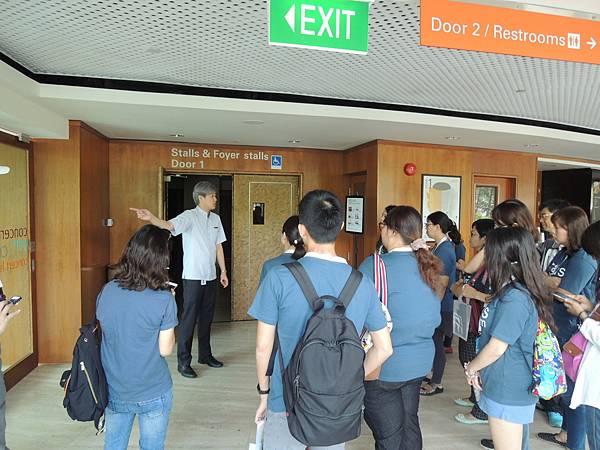 今天帶著我們導覽的是一位來自於北京的張先生,聽他的講述,似乎Esplanade建好的2002年就已經在這裡服務了,對於歌劇院的建築史以及在這裡演出過的經典戲劇瞭若指掌。新加坡歌劇院的產生歷經了兩次的努力,第一次是新加坡剛建國的時候,當時的文化部長提出議案,但被國會否決。後來又經過了十年,這位文化部長已經升官成新加坡總統了,又再一次的提出計畫,此時新加坡的財政狀況也比較好了,才順利通過。當時還因為新加坡剛建國,擔心建築工法不夠成熟,規定新加坡的建築公司如果要投標,必須和另一間國外公司合作。後來是新加坡和英國合作的公司得標標案。