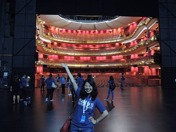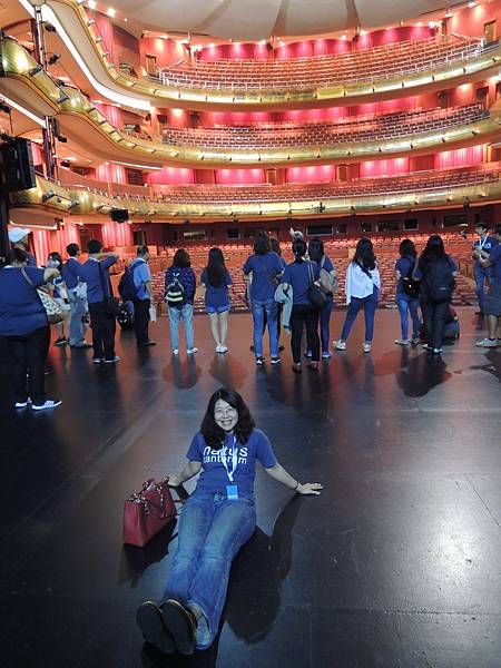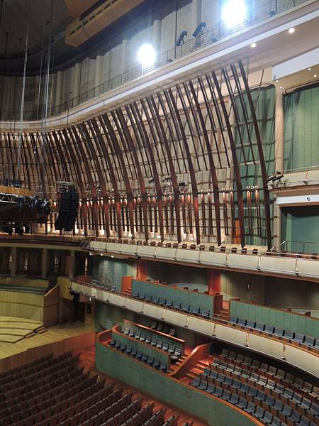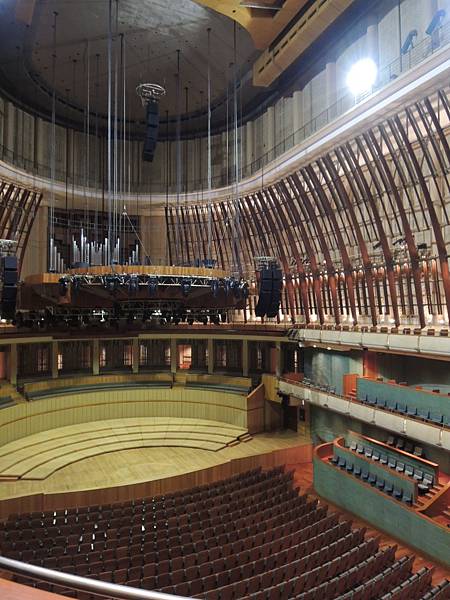 導覽的過程很有趣,導覽員不時舉了一個音樂廳裡的設備考大家這是做什麼用的,例如舞台正上方的一個可以升降的大圓盤,但天團不愧是天團,幾乎所有的問題都答對了,像是這個大圓盤是用來反射聲音用的,讓表演者可以及時聽見自己的聲音以便調整。我大部分都猜錯了,只有最後他考了一題,環繞音樂廳的紅柱子是做什麼用的,大家都在專業的猜測,只有我心想,這做好看的吧?!結果我答對了,裝飾用的哈哈。