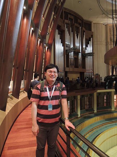 進到音樂廳裡面,新加坡的音樂廳全部都是用防火的木材材質建立的,舞台除了一般升降之外,還可以把前後排的椅子拆掉往前和往後延伸,如果需要更大的展演場地也沒問題。這裏的管風琴曾經是亞洲最大的管風琴,這個亞洲最大的稱號後來被韓國人搶走了。只是管風琴也不是大就好。整座音樂廳連內牆都是機關,整個內牆一共由84扇門圍城,這些門不是做好玩的,它們是用來反射聲音用的,每當一個國外團體要來演出,彩排的時候就是在彩排哪一扇門要開多少角度,可以讓整個音樂反射出最好聽的聲音。而且當演出結束,新加坡音樂廳會貼心地記下這一次演出每扇門的角度,如果之後同樣的團體回來做同樣的演出,彩排的時間便可以縮短。除了反射門之外,還有吸聲幕,這也是用來吸收聲音的。總之你會覺得在音樂廳裡面,處處都是機關,正所謂其中必有緣故,機關藏在內褲就是這樣來的。