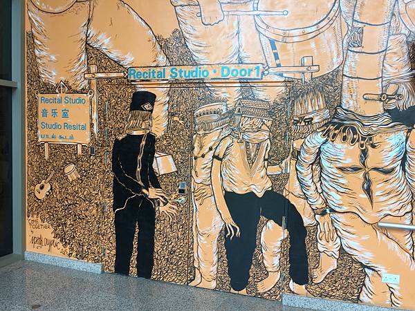 一開始我們從大門口的後台介紹起,Esplanade的建築和其他的歌劇院不同的是,他是先建好內部才蓋外牆,不像大多的大樓建築都是先蓋外牆才蓋內部,原因是因為擔心管風琴會運不進來。而且因為新加坡靠海,地鐵沒辦法挖太深,為了減少演出過程中地鐵經過帶來的震動,整座建築物的地底下還鋪上海綿來吸收震動,更厲害的是,這些鋪在地底下的海綿是可以檢查和修復的。這太厲害了。