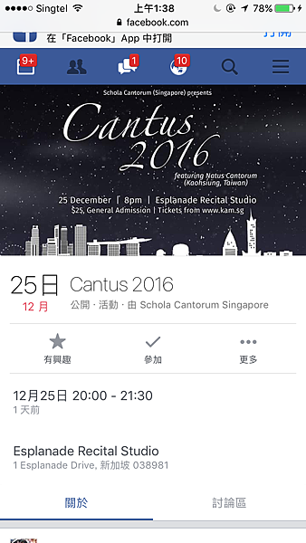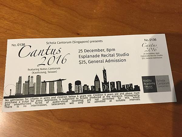 今天的音樂會主題是Cantus 2016,我外國語言不好,不知道為什麼叫這個哈哈,但是門票設計很漂亮,票面上是單純的白黑色相間,門票的下方畫了新加坡和高雄的地標,分別是Singapore flyer摩天輪、金沙酒店和高雄的85大樓地標等。看到的時候覺得很喜歡,兩個國家城市藉由音樂交流譜出一段美好的友誼。
