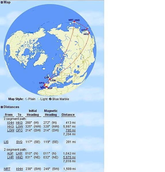 這次用了亞洲萬里通23萬哩加上稅金約15000新台幣兌換了兩張飛往歐洲的商務艙機票,長程的部份去程是搭乘國泰航空,回程是搭乘日本航空,其中還有亞洲接駁段高雄到香港一段,和歐洲內陸接駁段西班牙馬拉加機場到倫敦希斯洛機場。另外還包括兩段自理的歐洲內陸段,LGW-OPO和LIS-SVQ。最後一段東京回高雄的班機是用達美航空35000哩加上NT1900換了兩張NRT-KHH的機票。一次旅行一共飛了七個航段。