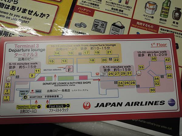 櫃台有JAL在希斯洛機場的指示圖,我們拍來當guide的。持商務艙登機證可以使用Fast track安檢,安檢不用排隊,從拿到登機證到進到管制區花不到10分鐘。上面也標註的貴賓室的位置,是使用BA的F lounge。