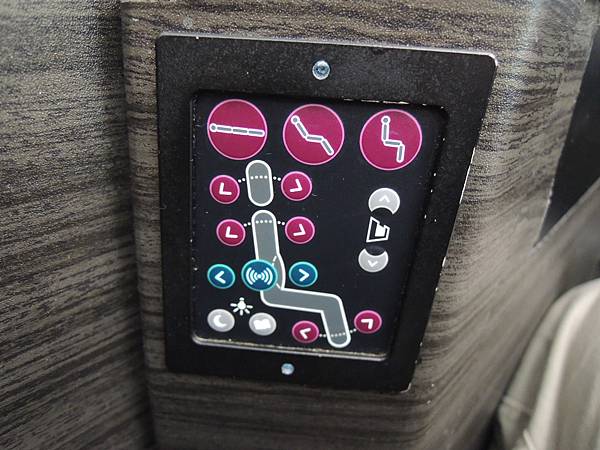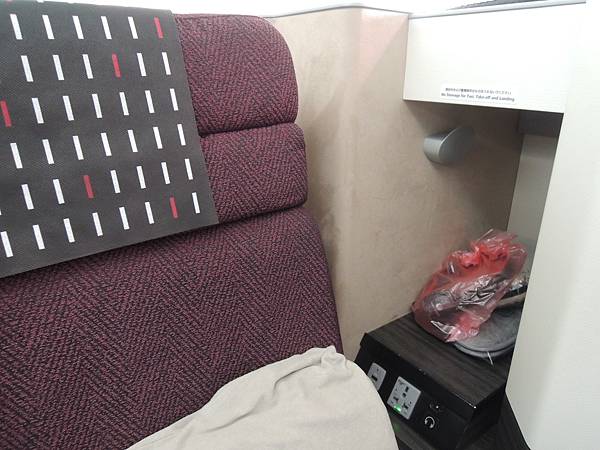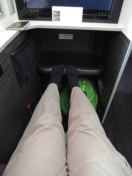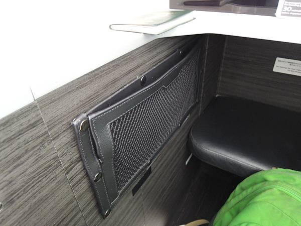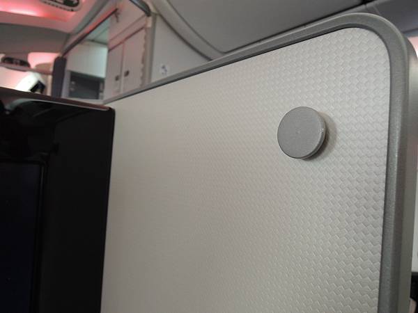 我讓老婆坐靠窗,我靠走道,意外發現這個小小空間,是我這一排獨有的,可以放進很多東西。靠窗的座位就沒有這個空間,靠走道的中間兩個位置據網友分享也沒有。我想這一排位置應該是所有商務艙座位裡置物空間最棒的一排