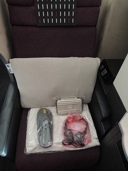 座位上已經放有過夜包、毯子、拖鞋和耳機。