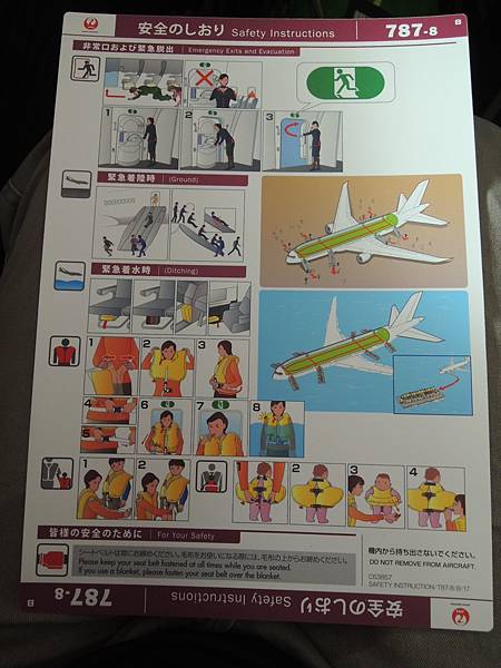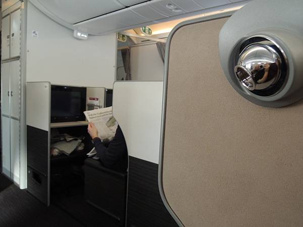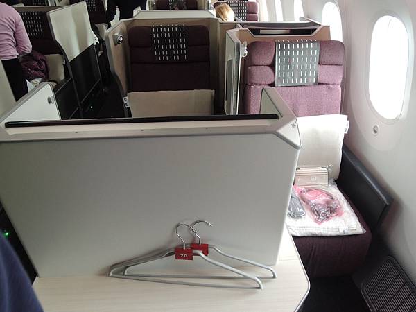 今天的座位在7A和7C,事先我們有上seatguru網站看座位,後來發現應該都差不多,我們這一側沒有廁所,但廁所其實也不太會影響到乘客。日航商務艙sky suite是2-2-2排列,每個座位都是一個隔間。我們選了靠窗的兩個座位,中間有隔板,如果隔壁是陌生人可以拉起來。如果是家人朋友,講話也很方便。個人覺得很讚的設計,尤其以我少少的商務艙經驗來看...