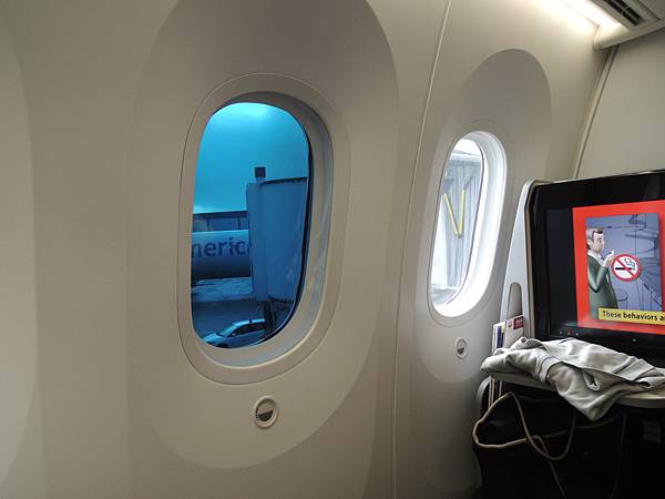787的特色是窗戶沒有真正的遮陽板,是靠電動去調整明暗度。這兩個窗戶就很明顯一個亮一個暗