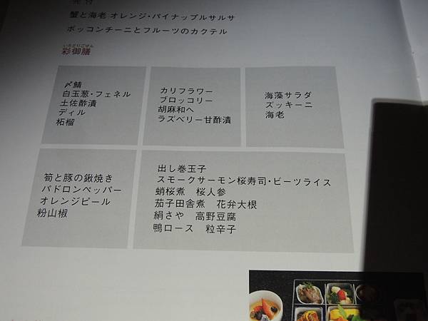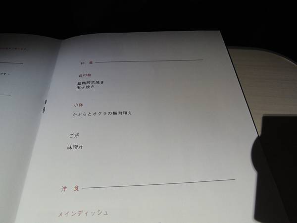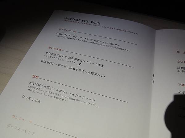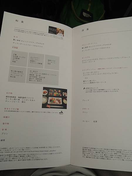 飛平之後就送來菜單。日航長程線固定只發一餐,其他的時間如果你餓了隨時可以點餐,直到降落前一個半小時停止供餐,算是擔心打擾客人而有的貼心服務。只是我一直怕睡過頭吃不到,到最後反而沒什麼睡都在吃...