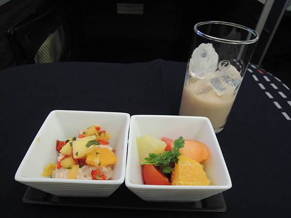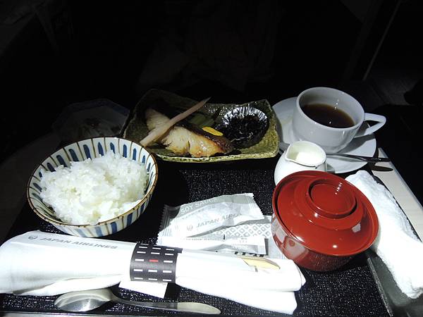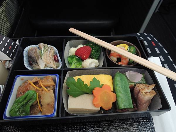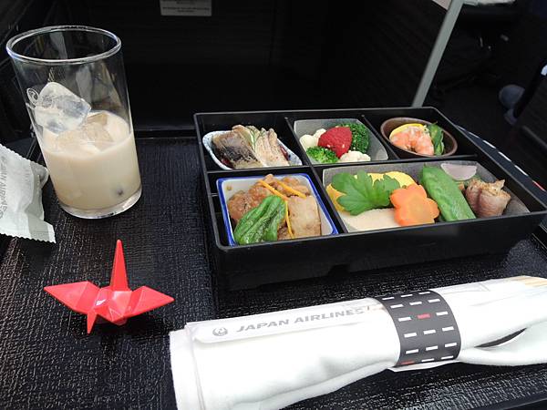 接著就是據說從九宮格縮水的六宮格和食。一開始空服員跑來問我們說因為和食供應量不夠,問我們有沒有要改洋食。如果平常為了不造成空服員的困擾我通常會答應,只是不好意思啦,鄉巴佬第一次搭日航,讓我體驗一下拜託...