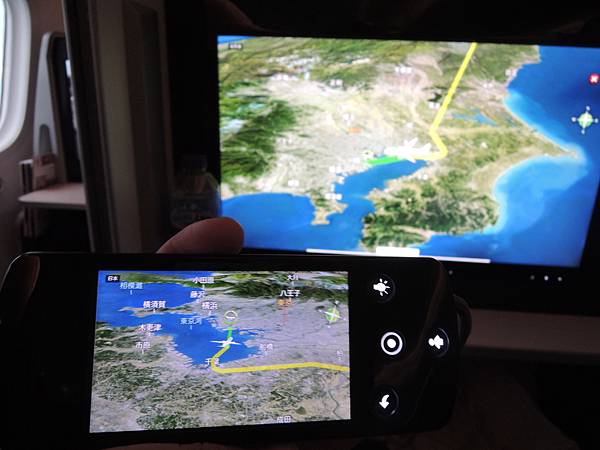 不知不覺的機長廣播要降落了,從這個角度看不到富士山。結果11個半小時的航程居然沒什麼睡,就在一直吃一直吃當中度過了。
