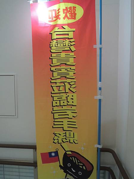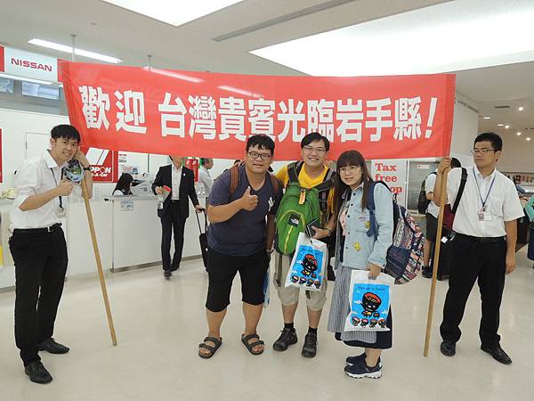 然後,就沒有然後了,我們坐在機艙第一排,第一個下機,空橋走道直接連接護照查驗,下機不到三分鐘就驗完護照,不到15分鐘就領完行李入境了... 走出管制區,一個人先領一袋小禮物,裡面是岩手縣的觀光手冊,還有一瓶礦泉水 (一月到岡山是送口罩),很溫暖。抬頭還看見這個紅布條,右邊的當地工作人員很入戲呀!