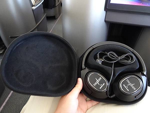 登機後看一眼新艙的配色,還蠻典雅的,我很喜歡。座位上已經放有枕頭和抗噪耳機。後來我是從雅加達搭乘ANA 787商務艙離開,我覺得長榮的配色和這個耳機的品質樂勝ANA。