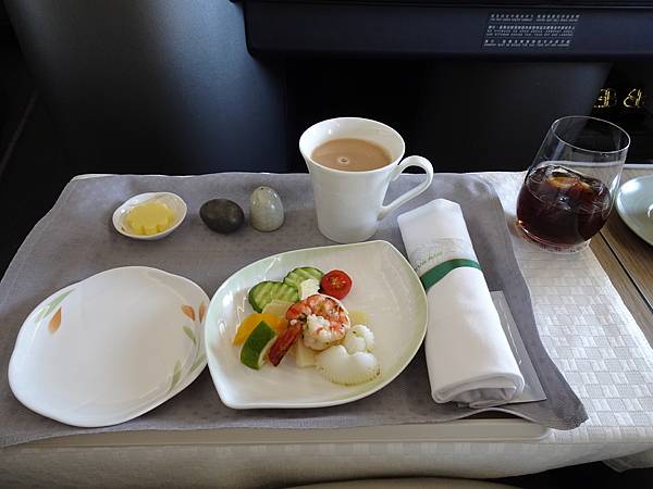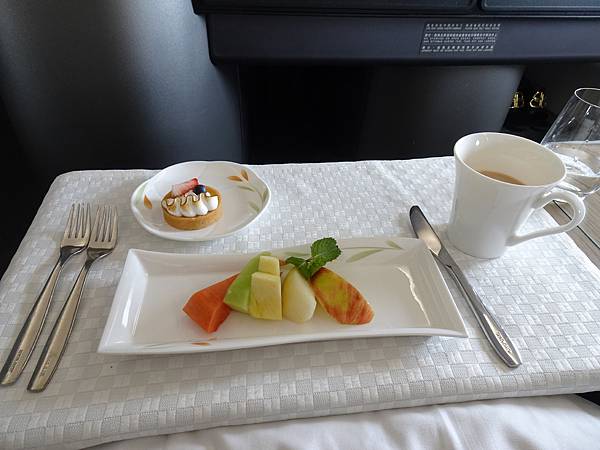 吃完主菜之後是甜點與水果,因為我不喝酒,這已經是我上飛機之後第四杯奶茶了,真的喝到不要不要的,飽到肚子裡不知道是水還是餐點。
