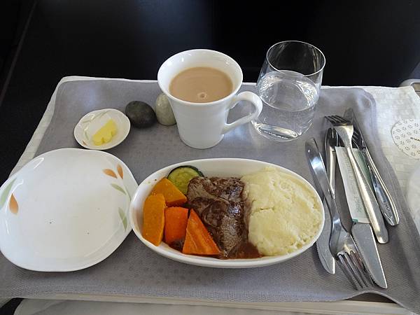 接著是餐點,我事先上網預訂了這個牛肉馬鈴薯,好吃! 預餐的時候好多餐點我都想吃啊,可惜只能選一種,胃也沒有多大。反觀華航,前天換了台北飛維也納的商務艙,上網要選餐居然只能選特殊餐,主餐完全沒有菜單給選。華航加油好嗎? 雖然長榮A330桂冠艙普通,但亞洲線5.5小時的航程,這樣的服務我是很滿意的。(預告一下,我下一腿ANA 7.5小時的商務艙也只能選西式或日式餐點,也沒有真的菜單給你挑)