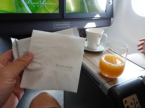 坐定後空服員送來毛巾和迎賓飲料,中間扶手的檯面實在太小了,和隔壁座位乘客的杯子只能前後放。